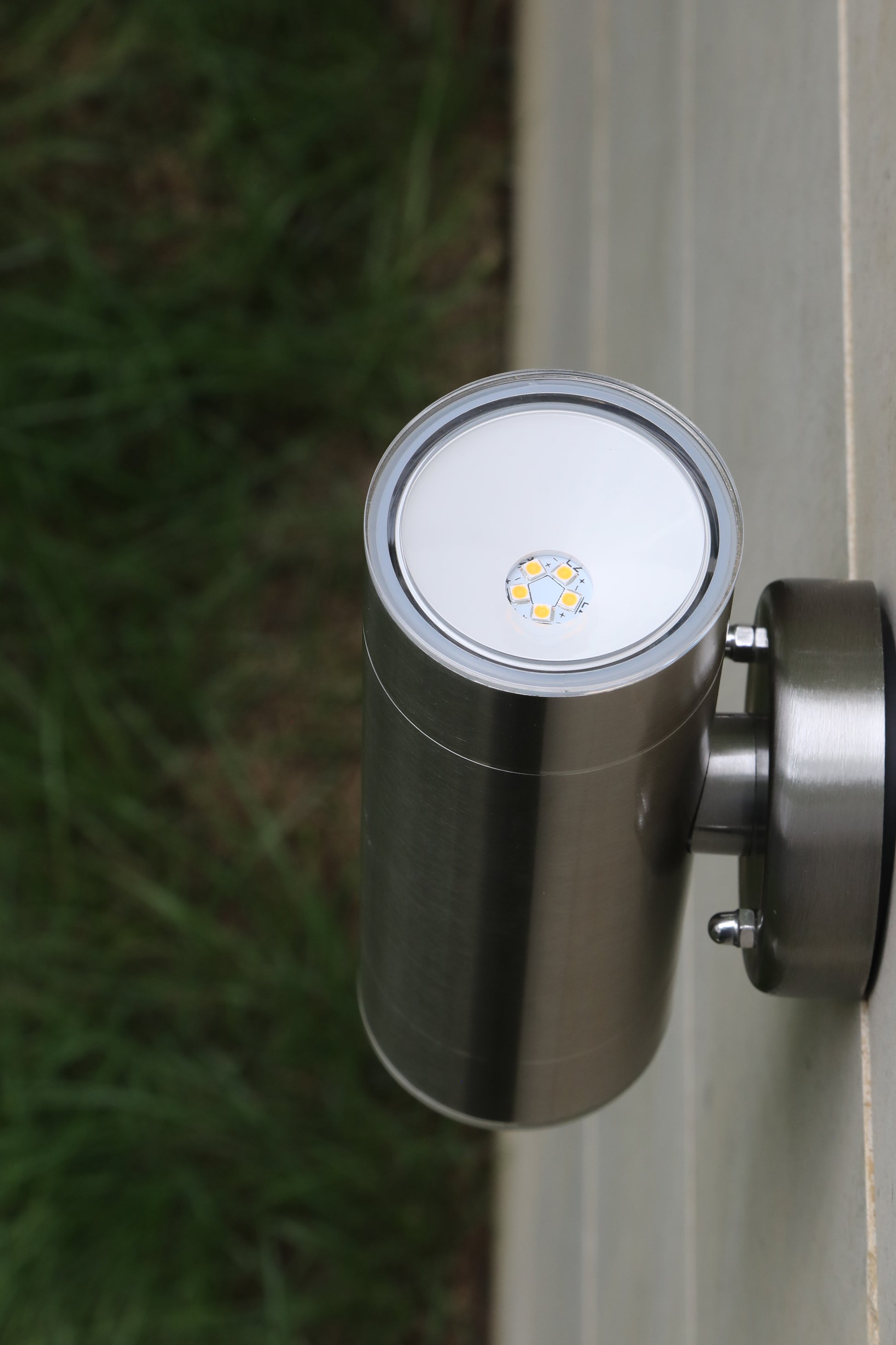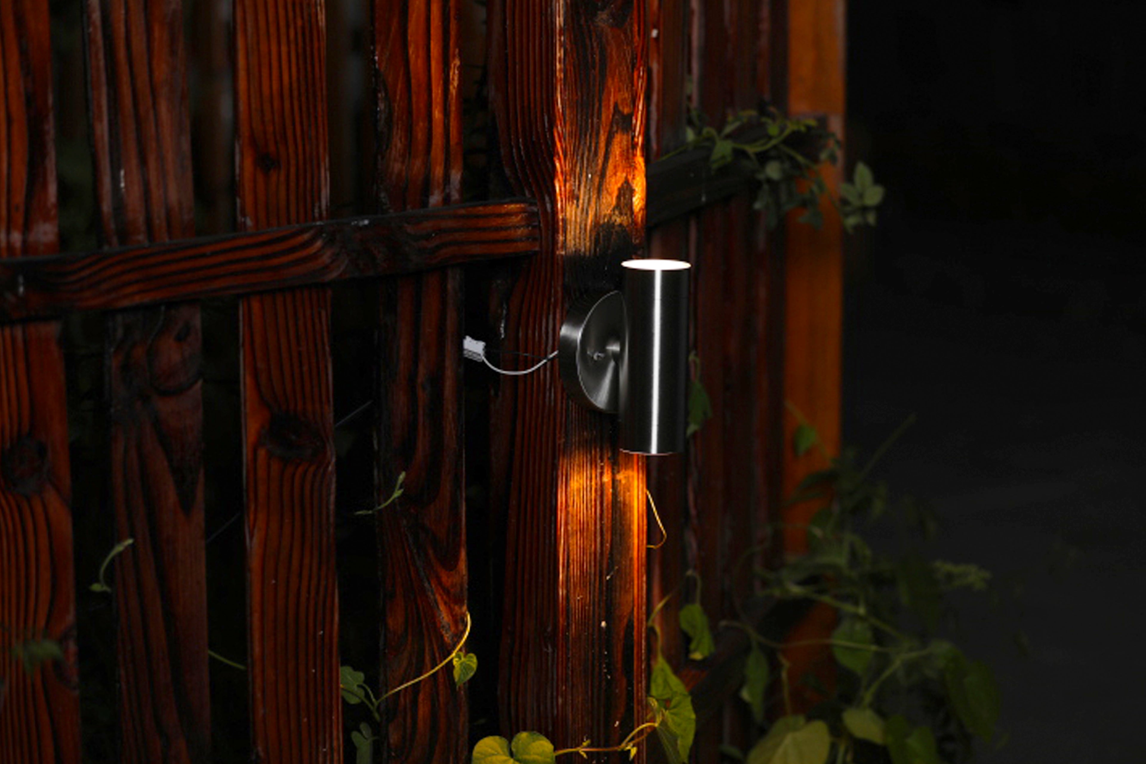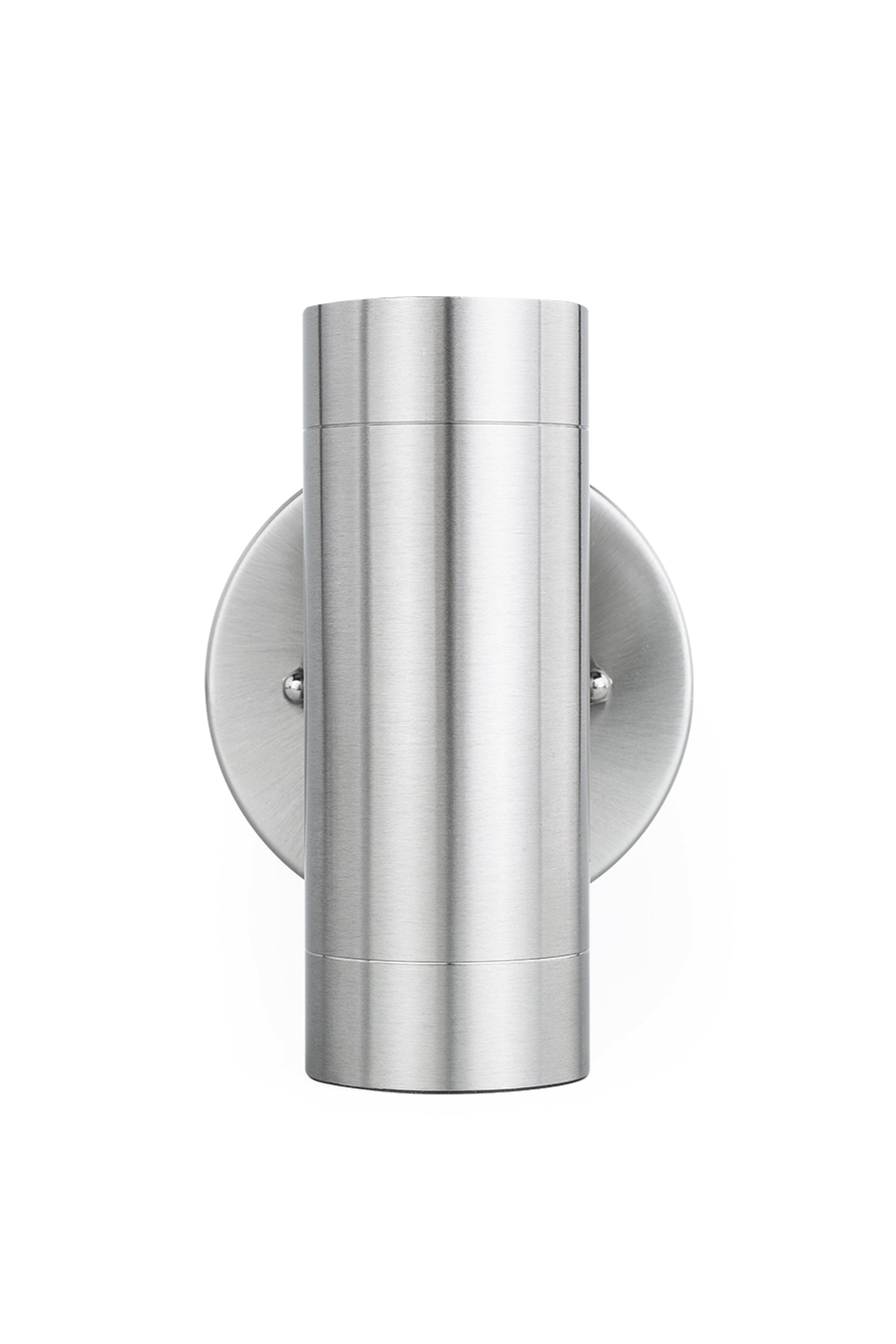 Modern and sleek design of this 2-light brushed stainless steel outdoor LED wall sconce will enhance any entryway. Illuminates from top and bottom and includes dark sky cover.